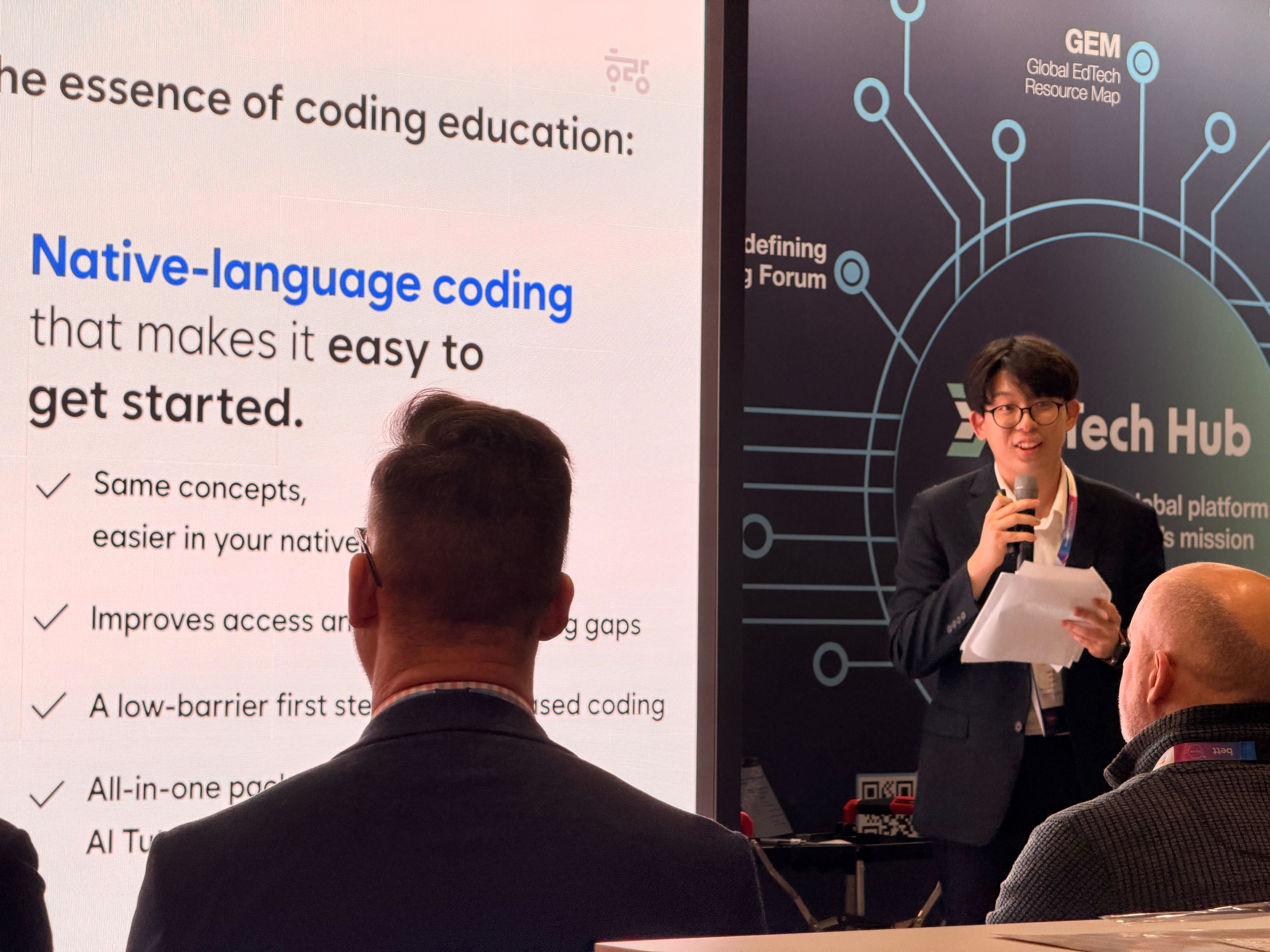 유도희 호랑에듀 대표는 비영어권 학생들의 코딩 진입 장벽을 낮추기 위해 개발된 '자국어 텍스트 코딩 엔진'을 발표했다.